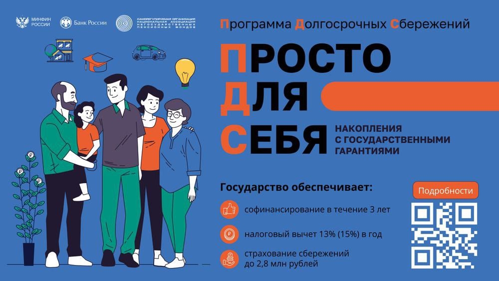 С 1 января 2024 года в России работает программа долгосрочных сбережений (ПДС). Программа долгосрочных сбережений граждан (ПДС) — это добровольный накопительно-сберегательный продукт с участием государства. Инструмент предусматривает активное самостоятельное участие граждан в накоплении капитала как за счет личных средств, так и за счет средств пенсионных накоплений. Подробнее в карточках.