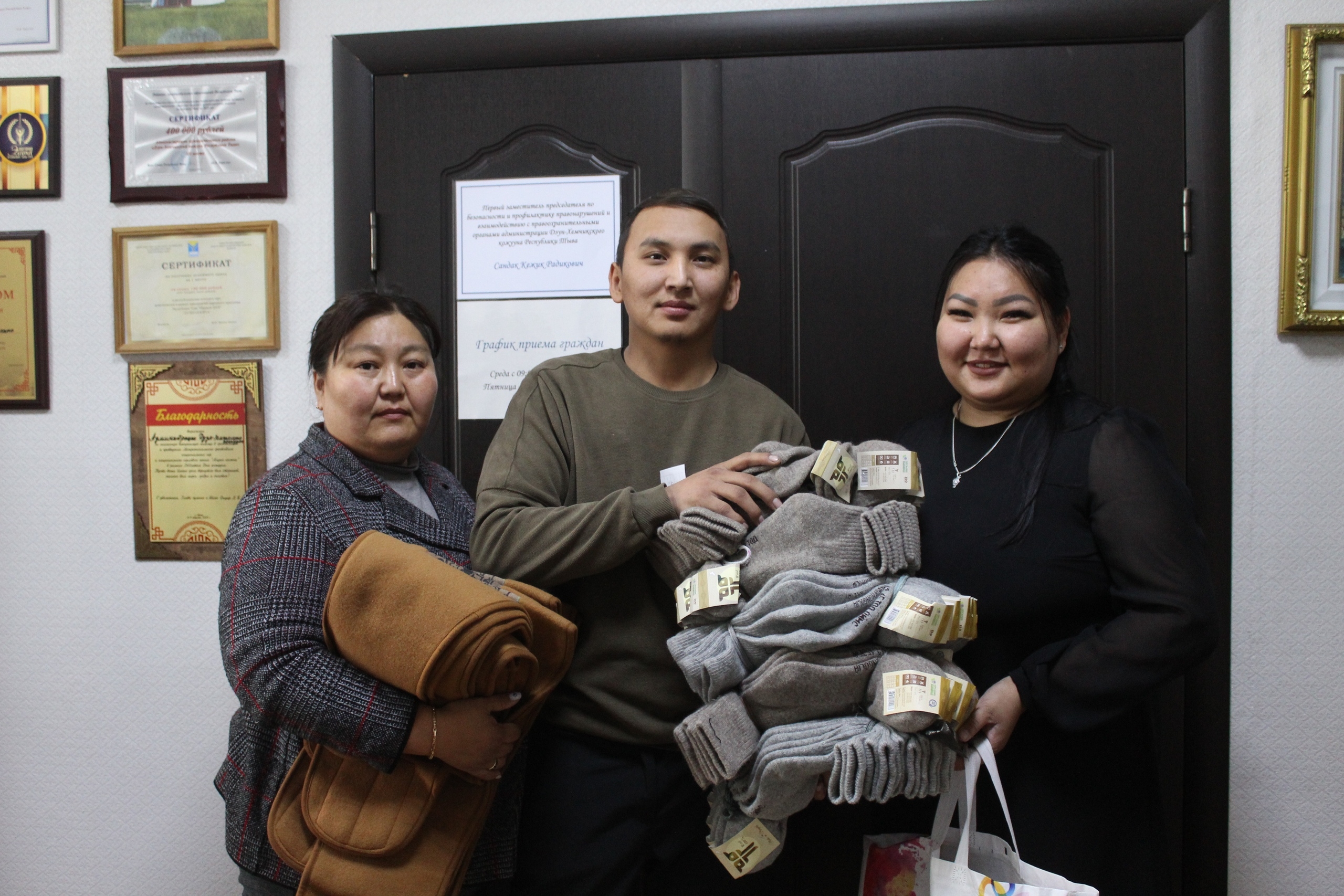 В преддверии Нового года продолжается сбор гуманитарной помощи военнослужащим, участвующим в СВО. Сегодня коллектив Тувинского технологического техникума передал теплые вещи: шерстяные носки, термопояса и стельки. Присоединяйтесь к акции! Пункт приема гуманитарной помощи в Дзун-Хемчикском кожууне: г. Чадан, ул. Ленина, д. 42, администрация кожууна, кабинет 303, отв. Монгуш Оюу Олеговна, специалист по молодежной политике, +7 (923) 388-99-86.