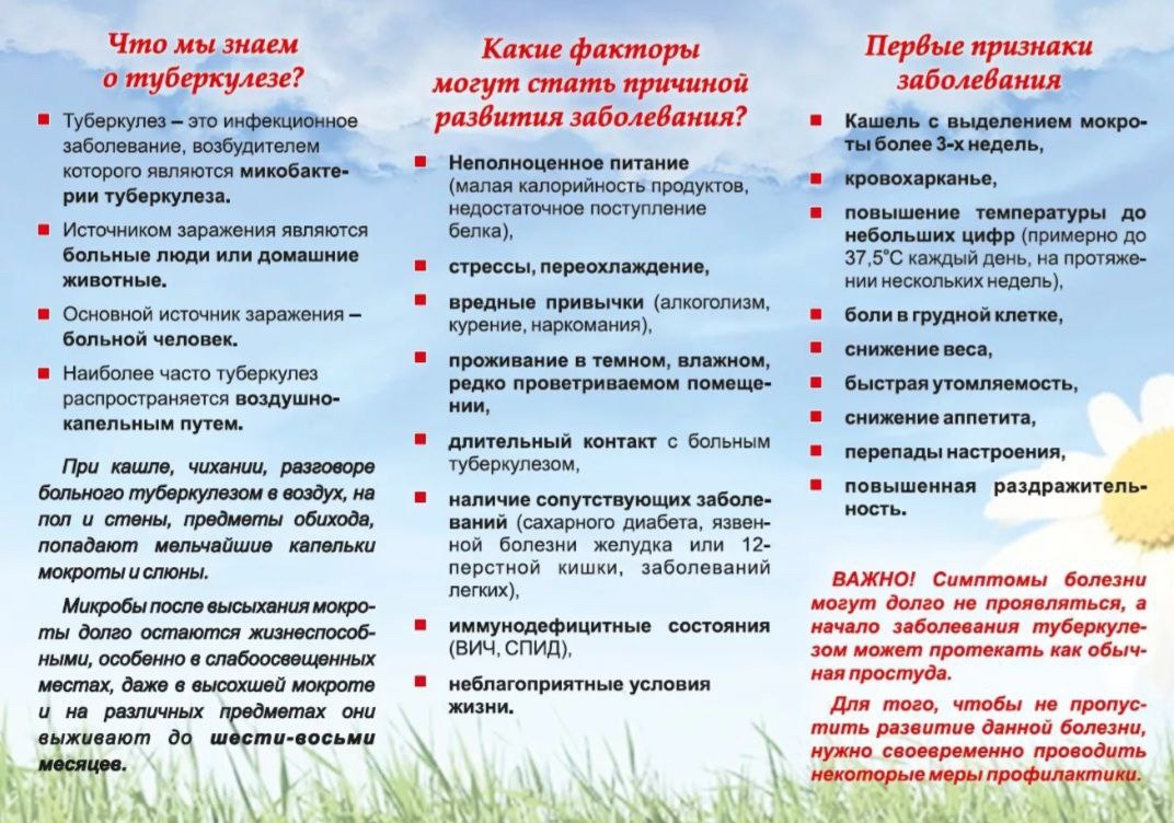 Туберкулез: важно знать! Туберкулез - это не просто болезнь из прошлого. Это серьезное инфекционное заболевание, которое может коснуться каждого. Но есть хорошие новости: туберкулез излечим, а главное - его можно предотвратить! Что важно помнить? Симптомы могут быть неявными. Ранняя диагностика - ключ к успешному лечению. Существуют меры профилактики. Не оставайтесь в стороне! Заботьтесь о своем здоровье и здоровье близких. Узнайте больше о туберкулезе и способах его предотвращения в памятке.