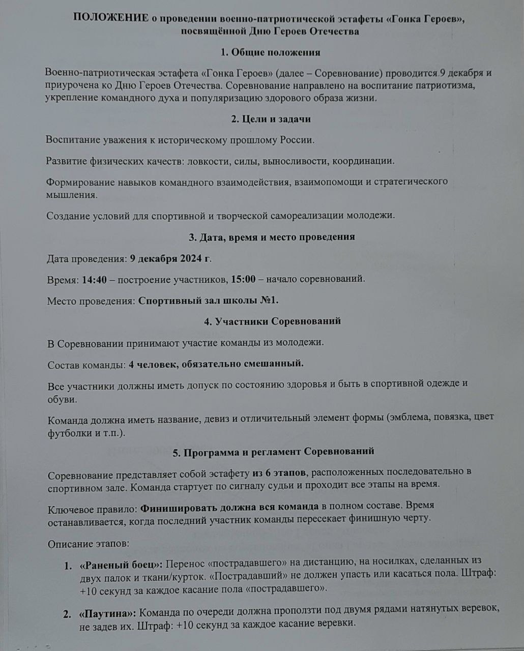 Уважаемые жители Монгун-Тайгинского кожууна! Приглашаем всех желающих принять участие в командной эстафете, которая станет настоящей проверкой вашей сплоченности, скорости и умения поддерживать друг друга. Мероприятие состоится 9 декабря в спортивном зале школы N°1 с. Мугур-Аксы. Программа эстафеты включает: Шесть захватывающих этапов: "Раненый боец", "Паутина", "Болото", "Снайпер", "Забор", "B едином строю!" К участию допускаются команды: Состоящие из 4 человек (допускается смешанный состав). Возрастные ограничения: от 14 до 35 лет. Команды должны иметь оригинальное название, звучный девиз и уникальный элемент экипировки. Время: 14:35 - Сбор и построение команд. 15:00 - Начало эстафеты. Для регистрации и получения дополнительной информации обращайтесь: Контактное лицо: Сайын-Маадыр А.С. Телефон: 8 (923) 544-33-67 Электронная почта: Avlaana07@mail.ru Дополнительно: Полные правила проведения эстафеты и детальная информация доступны в прикрепленном документе "Положение об эстафете".