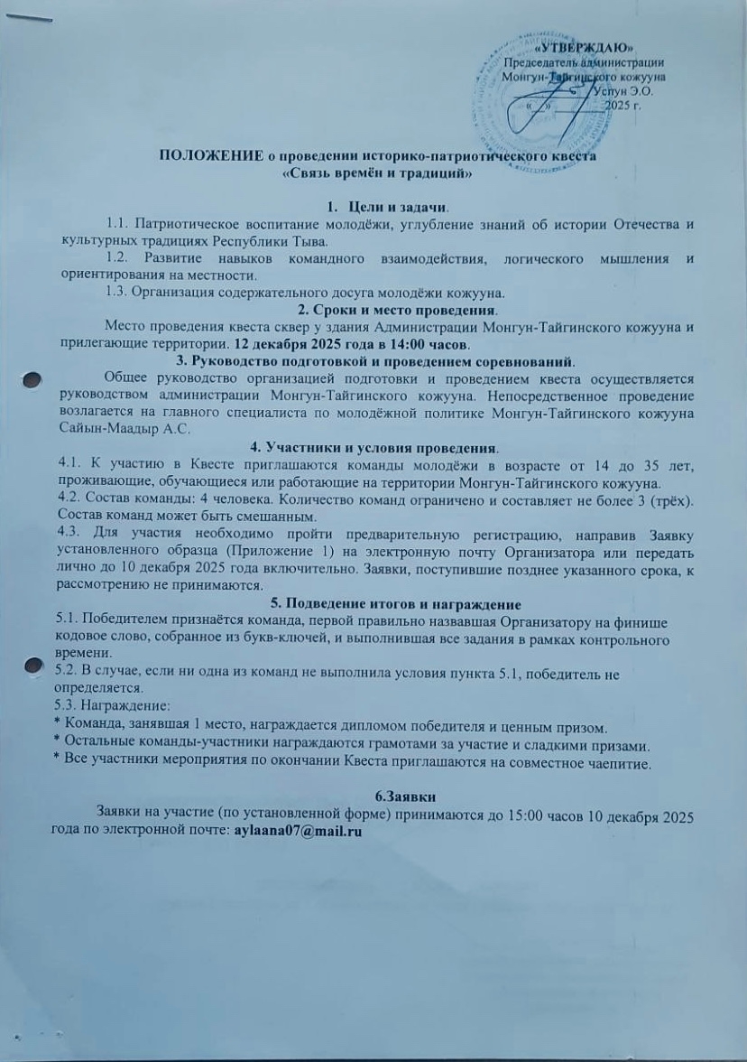 Приглашаем команды на историко-патриотический квест «Связь времён и традиций»! Когда: 12 декабря 2025 г. (пятница), в 14:00 часов. Где: Старт в сквере у здания Администрации кожууна. Участники: Команды из 4 человек (14-35 лет). Регистрация обязательна. Количество команд — не более 3-х. Как зарегистрироваться? Соберите команду, заполните заявку и отправьте до 15:00 часов 10 декабря на почту: aylaana07@mail.ru Форму заявки и полную информацию можно получить у главного специалиста по молодёжной политике Сайын-Маадыр А.С. по телефону 89235443367 или запросить по указанной почте. Подробные условия проведения квеста изложены в прикрепленном Положении.