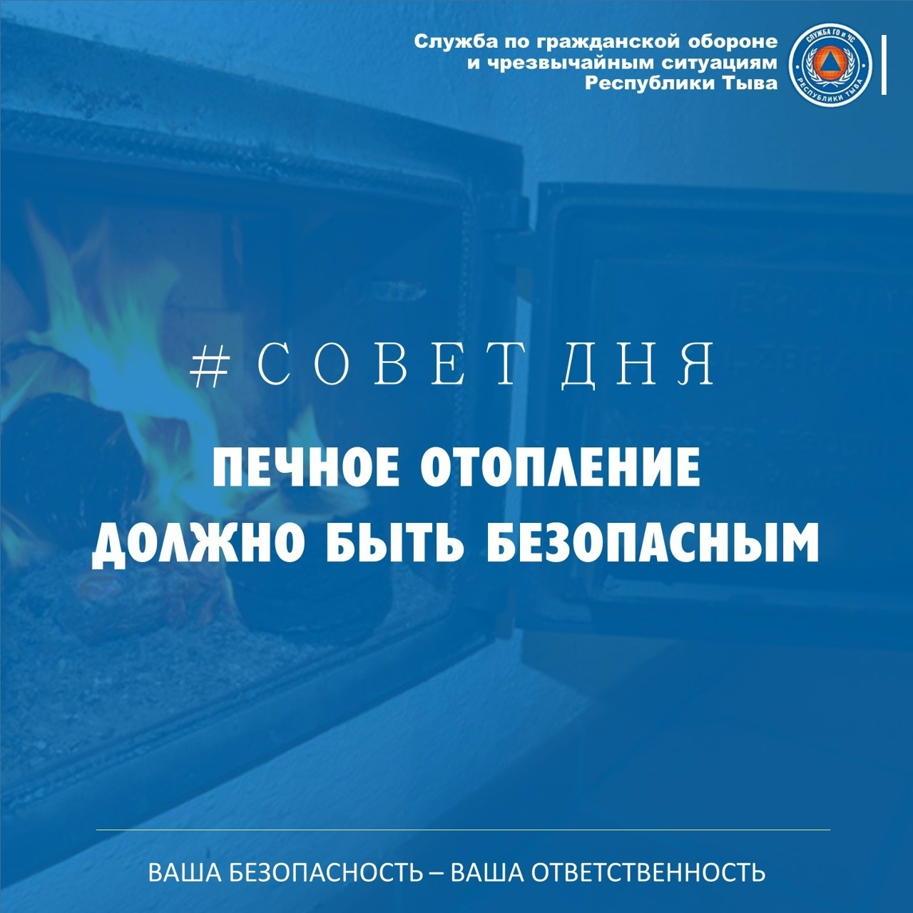 СОВЕТ ДНЯ Печное отопление должно быть безопасным С началом отопительного сезона печное отопление становится источником повышенной опасности. Служба ГО и ЧС Республики Тыва обращают внимание, что при эксплуатации печного отопления запрещается: - Оставлять без присмотра топящиеся печи, а также поручать детям надзор за ними. - Располагать топливо и другие горючие вещества, и материалы на предтопочном листе. - Применять для розжига печей бензин, керосин, дизельное топливо и другие легковоспламеняющиеся жидкости. - Топить углем, коксом и газом печи, не предназначенные для этих видов топлива. - Производить топку печей во время проведения в помещениях собраний и других массовых мероприятий. - Перекаливать печи. - Устанавливать металлические печи, не отвечающие требованиям пожарной безопасности, стандартам и техническим условиям. При установке временных металлических и других печей заводского изготовления должны выполняться указания (инструкции) предприятий-изготовителей, а также требования норм проектирования, предъявляемые к системам отопления. Для вызова экстренных оперативных служб звонить по короткому номеру 112.