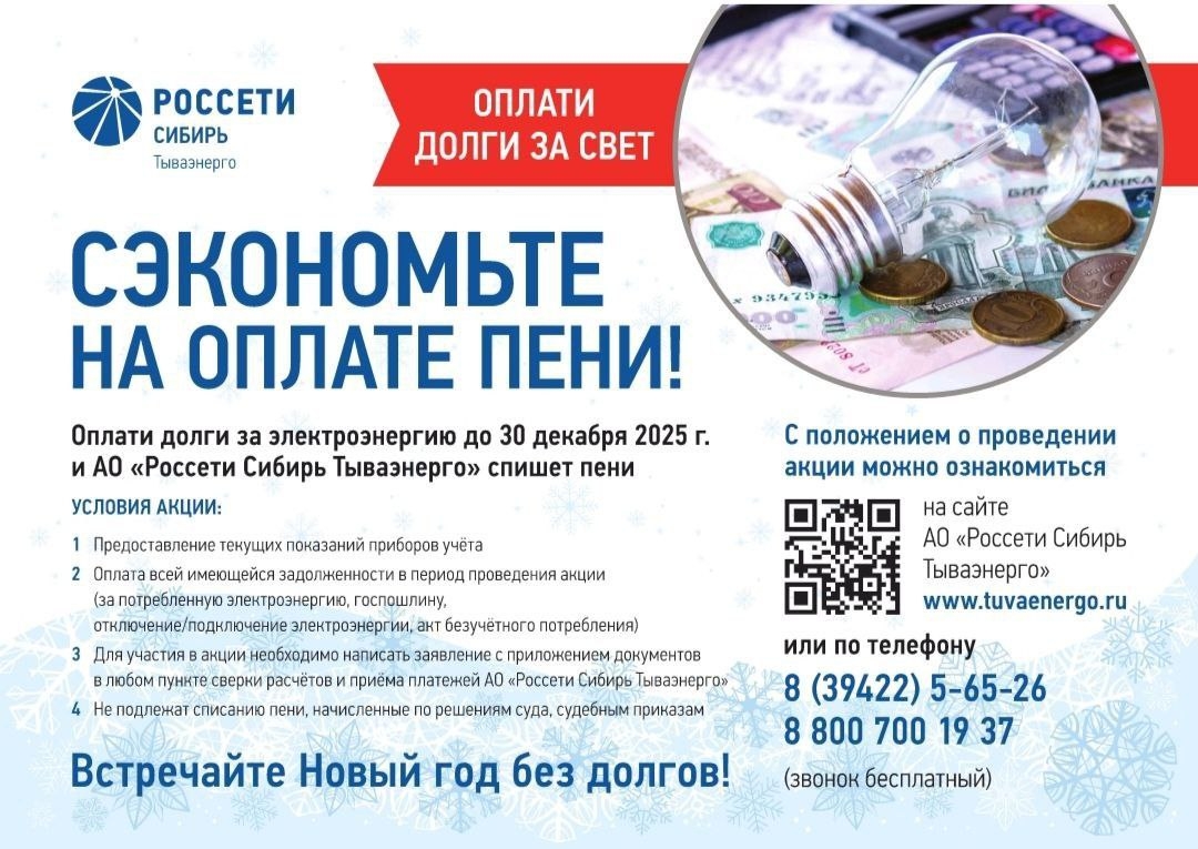 «Россети Сибирь Тываэнерго» проводит предновогоднюю акцию «Сэкономь на оплате пени!» Потребители–физические лица могут расплатиться с долгами за электроэнергию без штрафных санкций в виде начисленной пени. У акции всего два условия: Предоставить текущие показания приборов учёта Оплатить всю задолженность до 30 декабря 2025 года — за потреблённую электроэнергию, госпошлину, отключение/подключение электроэнергии и акт безучётного потребления Для участия нужно написать заявление с приложением документов в любом пункте сверки расчётов и приёма платежей «Россети Сибирь Тываэнерго». Не подлежат списанию пени, начисленные по решениям суда и судебным приказам. Подробную информацию об условиях можно получить по телефонам: 8-800-700-1937 и 8 (39422) 5-65-26. С положением о проведении акции можно ознакомиться на сайте «Россети Сибирь Тываэнерго»: tuvaenergo.ru/ Оценили 2 человека