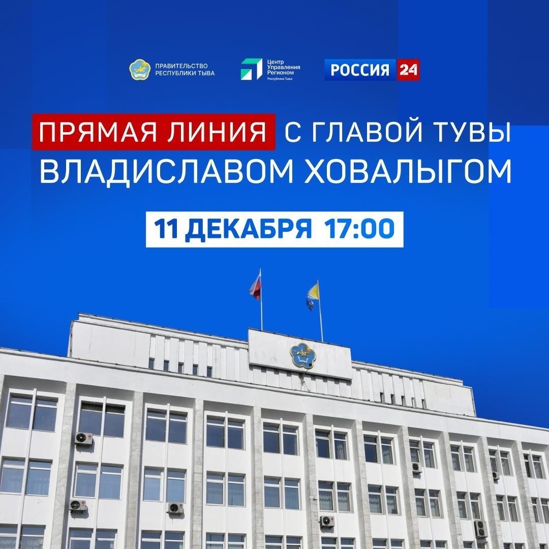 Глава Тувы Владислав Ховалыг 11 декабря в 17:00 часов в эфире телеканала «Россия 24» ответит на вопросы жителей в режиме онлайн. Предварительный сбор основных актуальных вопросов стартовал с конца ноября.