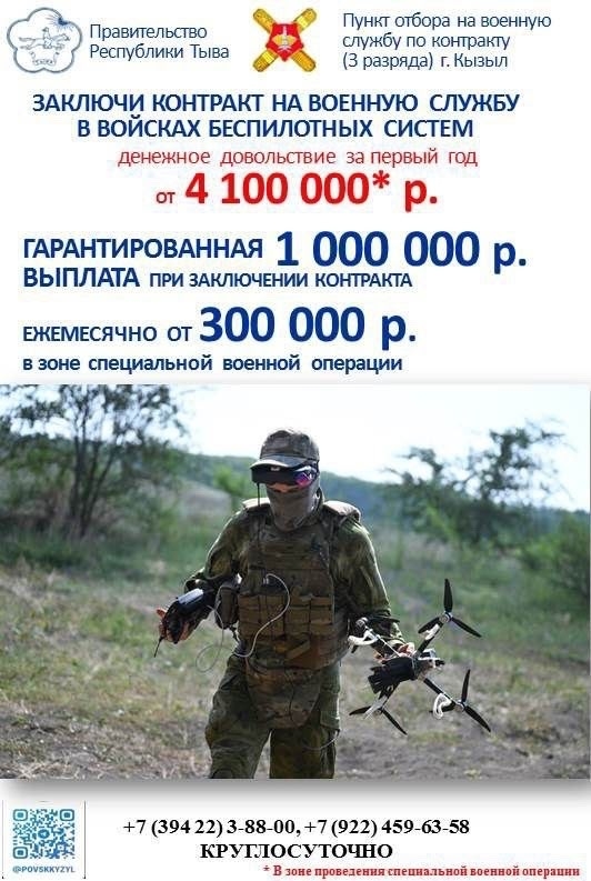 Открыт набор кандидатов на военную службу по контракту в войсках беспилотных систем! количество вакантных должностей ограничено, обращаться по тел.: 89994850507 Пункт отбора на военную службу по контракту г.Кызыл, ул. Абаканская 45.