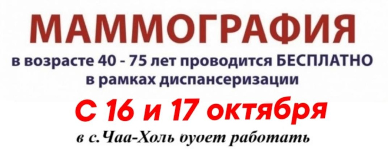 Хүндүлүг херээжен чонувус! Октябрь 16 биле 17-ниң хүннеринде Чаа-Хөл суурга эмиктиң аарыгларын шинчилеп илередиир аппараттыг автомашина (МАММОГРАФ) келгенин дамчыдып тур! 40 хардан өрү назылыг херээжен чон (ылаңгыя албан эртер эмчи шинчилгелерин (медосмотр) болгаш диспансеризация эртип турар улус халас кирип алыры күзенчиг. Сөөлгү үеде Тыва иштинде эмиктиң ыжык аарыглары (рак молочной железы) нептереп турары-биле эмчи шинчилгелерин үе-шаанда эртип алыры чугула! КАДЫК БОЛУҢАР!