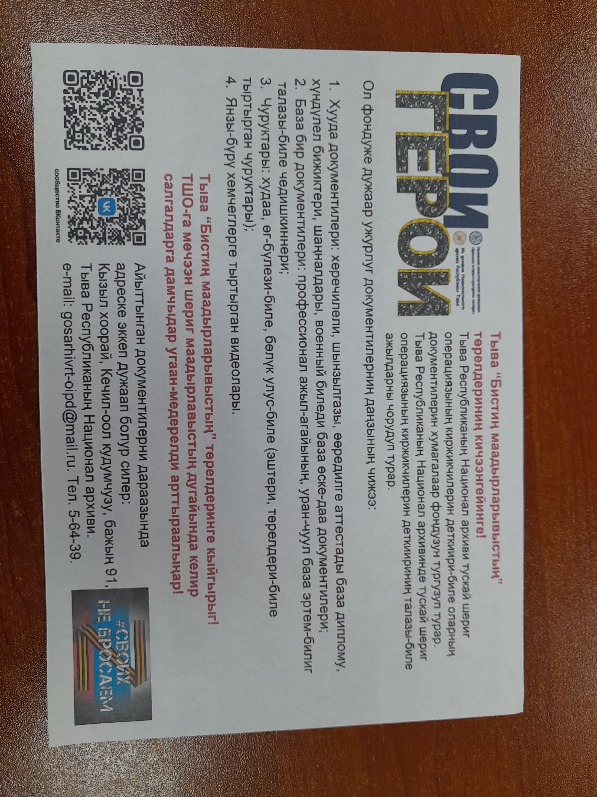 Тыва "Бистиң маадырларывыстың" төрелдериниң кичээнгейинге! Тыва Республиканың Национал архиви тускай шериг операциязының киржикчилерин деткиири-биле оларның документилерин хумагалаар фондузун тургузуп турар. Тыва Республиканың Национал архивинде тускай шериг операциязының киржикчилерин деткиириниң талазы-биле ажылдарны чорудуп турар. Ол фондуже дужаар ужурлуг документилерниң даңзызының чижээ: 1. Хууда документилери: херечилели, шынзылгазы, өөредилге аттестады база диплому, хүндүлел бижиктери, шаңналдары, военный биледи база өске-даа документилери; 2. База бир документилери: профессионал ажыл-агайының, уран-чүүл база эртем-билиг талазы-биле чедиишкиннери; 3. Чуруктары: хууда, өг-бүлези, бөлүк улус-биле (эштери, төрелдери-биле тыттырган чуруктары); 4. Янзы-бүрү хемчеглерге тыттырган видеолары. Тыва "Бистиң маадырларывыстың" төрелдеринге кыйгырыг! ТШО-га мөчээн шериг маадырларывыстың дугайында келир салгалдарга дамчыдар угаан-медерелди арттыраалыңар! Айыттынган доккментилерни дараазында адреске эккеп дужаап болур силер: Кызыл хоорай, Кечил-оол кудумчузу, бажың 91, Тыва Республиканың Национал архиви. e-mail: gosarhivrt-oipd@mail.ru. Телефон: 8-394-22-5-64-39.