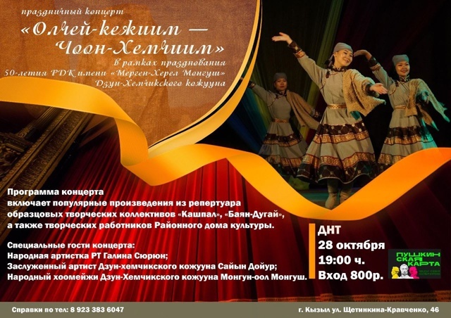 Хүндүлүг көрүкчүлеривис, силер бүгүдени октябрь 28-те19:00шакта "Чөөн-Хемчик кожууннуң "Мерген-Херел Монгуш" аттыг культура бажынының 50 чылдаан юбилейинге тураскааткан " Өлчей кежиим-Чөөн-Хемчиим" депчогаадыкчы чараш концертивисче чалаптур бис. Болур чери: ДНТ Кызыл хоорай,ортээ 800 акша