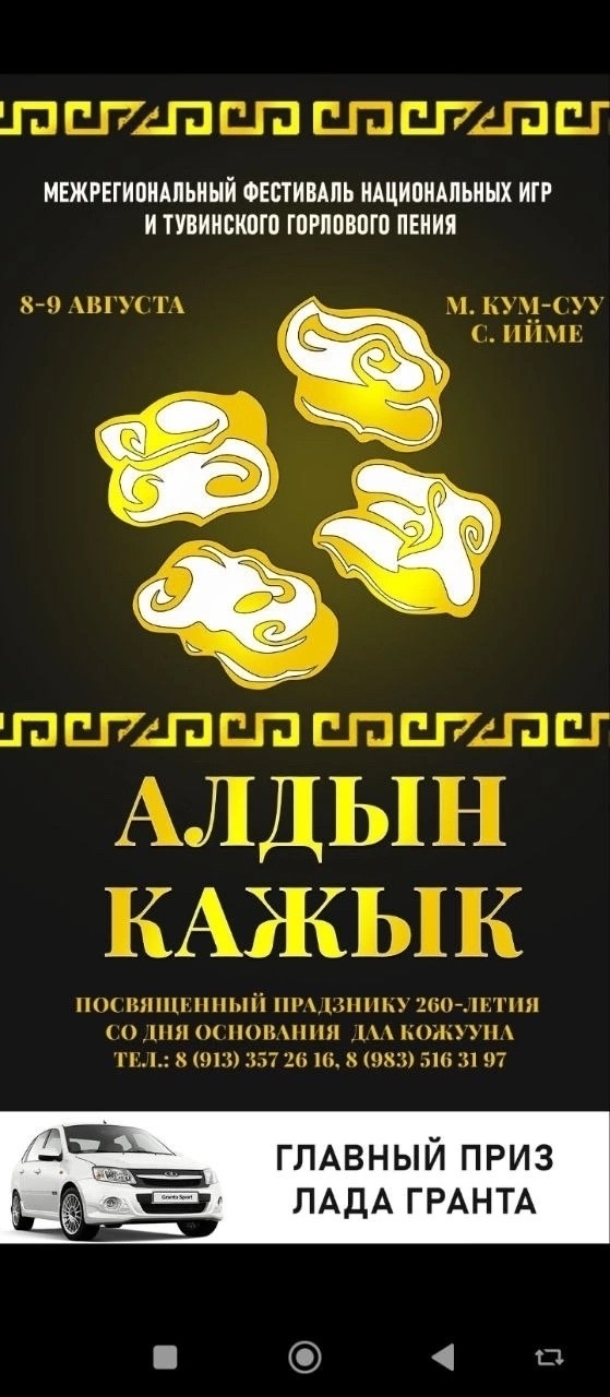 Хүндүлүг чонувус! Чөөн-Хемчик кожууннуң Ийме сумузунга чайын чурумалдыг, чараш ораны - Кум-суувустуң бажы - чоннуң сөөлгү үеде тырттыржып турар ыдык кайгамчыктыг черлериниң бирээзи "Алдын элезинивистиң" баарынгаавгуст 8-9-таболуп эртер Даа кожуунувустуң 260 чылынга тураскааткан Россия чергелиг( Межрегиональный) «АЛДЫН КАЖЫК» деп, машина шаңналдыг " Россияның алдарлыг артизи, Тываның улустуң хөөмейжизи, Делегейге ат-алдары чаңгыланып артып калган Конгар-оол Борисович Ондарның чогаадып каан дүрүмнери-биле кажык оюнунга "Аът чарыжы" болуп эртер! Төөгүде болуп көрбээн улуг байырлалды Силер бүгүдеге бараалгадыр-дыр бис! Адаан-мөөрей оюннарның болур хемчеглери: 1) "Алдын кажык" хой кажыынга аът чарыжы (дадывыры 5 муң акша); 2) "Сыгыт-хөөмей, каргыраамны"; Тыва республиканың Улустуң хөөмейжилери, Ийме Улаан-Быраа оолдары Бады-Доржу Ондар биле Эртине Туматтың шаңналы дээш. 3) Тыва ча маргылдаазы - "Баг адары"; 4) 18 хар чедир мөгелер аразынга "Тыва хүреш". 5) Элезинге 3 кижи киржир "Хол бөмбүү"; 6) Ус шеверлер делгелгези. Шаңналдары: "Алдын кажык": 1-ги чер - Чаа чычаан "Лада Гранта"; 2-ги чер - Дөрт чүзүн мал болгаш 10 муң акша; 3-кү чер - Дөрт шыырак хой болгаш 10 муң акша. 4-кү чер - Үш хой болгаш 10 муң акша. 5-ки - Ийи хой болгаш 5 муң акша. "Баг адары": 1-ги чер - 30 муң акша болгаш бир хой; 2-ги чер - 25 муң акша; 3-кү чер - 15 муң акша; 4-кү чер - 10 муң акша; 5-тен 8-ки чер - 5 муң акша. 18 хар чедир мөгелер аразынга элезинге "Тыва хүреш": 1-ги чер - Эзер, чүген-чуларлыг, кымчылыг, кижен болгаш сыдымныг бүрүн аът болгаш, 5 муң акша; 2-ги чер - Молдурга, 3 муң акша; 3-кү чер - Үш шыырак хой, 2 муң акша. 4-кү чер - Ийи шыырак хой. 5-тен 8-ки черге чедир - шыырак хойлар. Элезинге "Хол бөмбүү": Шаңналдар дадывыр түңүнден хамааржыр болгаш 1-ги чер алган бөлүкке 1 хой. "Сыгыт-хөөмей, каргыраамны": Тываның Улустуң хөөмейжилери Бады-Доржу Ондар биле Эртине Туматтың чажыт шаңналды дээш. Тыва чуртувустуңтуризимин улам-дам хөгжүдүп, Делегейге алдаржыдып, улуг идегел, бүзүрел-биле эчис-сорулганы салып, төөгүде туруп көрбээн чараш байырлалды организастап тур бис, чонум. Хүндүткел-биле бүгү чонну кыйгырдым! Хүлер Ондар ( Тыва ). "АЛДЫН КАЖЫК" мөөрейиниң киржикчилери заявкаларын хүлээдип ат сывын бижидипэгелей берген! Оюннарга киржир күзелдиг чонувусту база айтырыглар бар болза, бо агар-санче идекпейлии-биле долгаарын диледивис: 89133572616