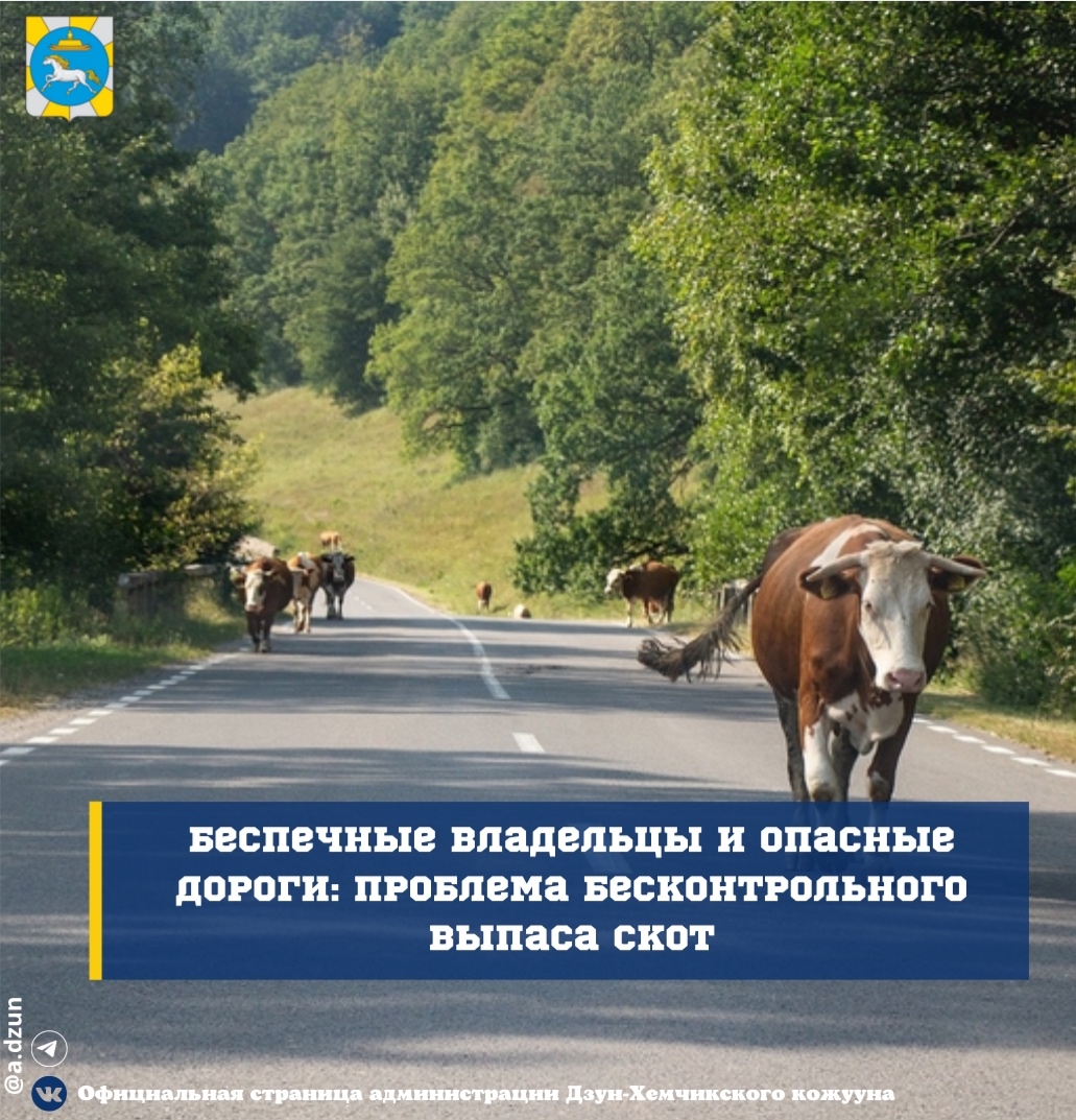 В последнее время участились случаи появления домашнего скота на автомобильных дорогах. Бесконтрольный выпас животных вблизи трасс – это не только административное нарушение, но и серьезная угроза безопасности как для водителей, так и для самих животных. Почему это опасно? • ДТП с участием скота нередко приводят к тяжелым травмам, гибели людей и животных, а также к значительному материальному ущербу. • Неожиданное появление животного на дороге может привести к непредсказуемым маневрам водителей, что увеличивает риск аварии. Что делать? В связи с участившимися инцидентами администрация Дзун-Хемчикского кожууна призывает владельцев скота соблюдать правила выпаса, не допускать бесконтрольного нахождения животных вблизи дорог, особенно в темное время суток. Нарушителям грозит административная ответственность в виде штрафов и возмещение ущерба в случае ДТП. Водителям рекомендуется проявлять повышенную бдительность вблизи знаков «Перегон скота», снижать скорость в темное время суток и в местах возможного появления животных на дороге. Важно! При обнаружении безнадзорно пасущегося скота вблизи дорог, необходимо незамедлительно сообщать об этом в органы полиции или администрацию для оперативного принятия мер. Только совместными усилиями мы сможем обеспечить безопасность на дорогах и предотвратить трагические последствия бесконтрольного выпаса скота.