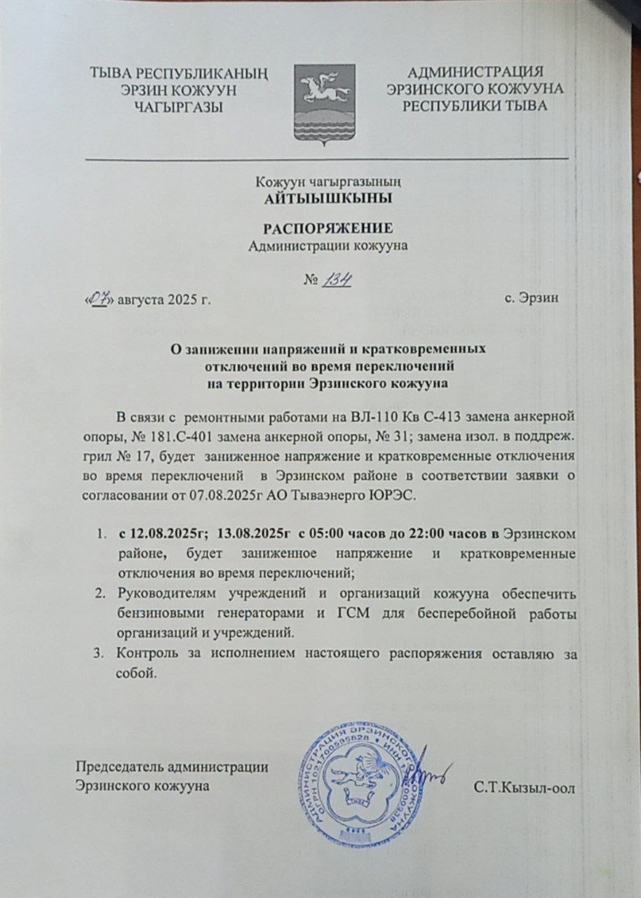 Уважаемые земляки В связи с проведением ремонтных работ 12,13 августа с 05.00 ч до 22.00 ч, сообщаем вам о временном снижении напряжения в электросетиПросим вас принять необходимые меры предосторожности и подготовиться заранее. Берегите бытовую технику и электроприборы. Спасибо за ваше внимание и понимание ситуации. #Тываэнергосбыт