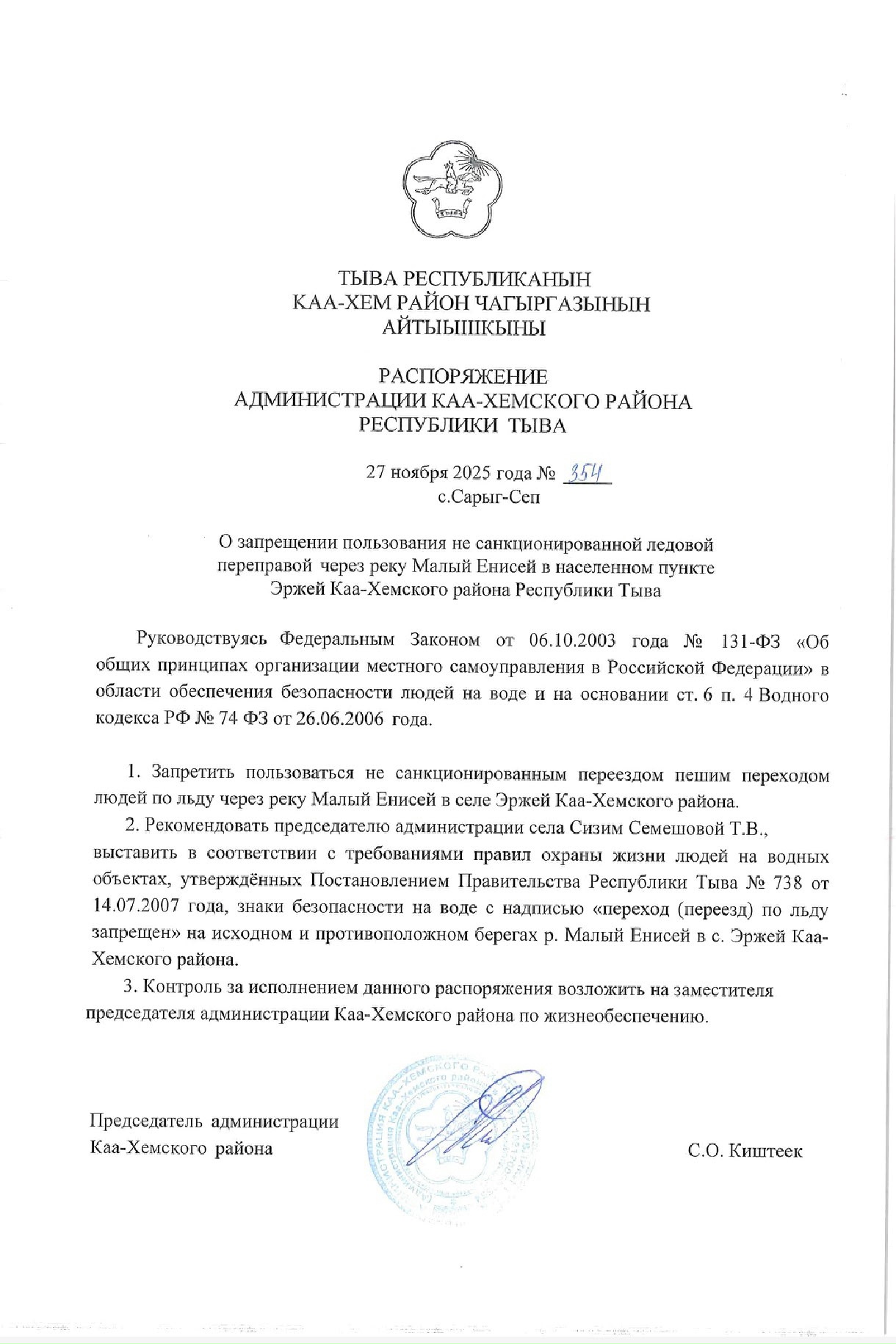 Администрацией Каа-Хемского района вынесено Распоряжение № 354 от 27.11. 2025 года " О запрещении пользования несанкционированной ледовой переправой через реку Малый Енисей в населенном пункте Эржей".
