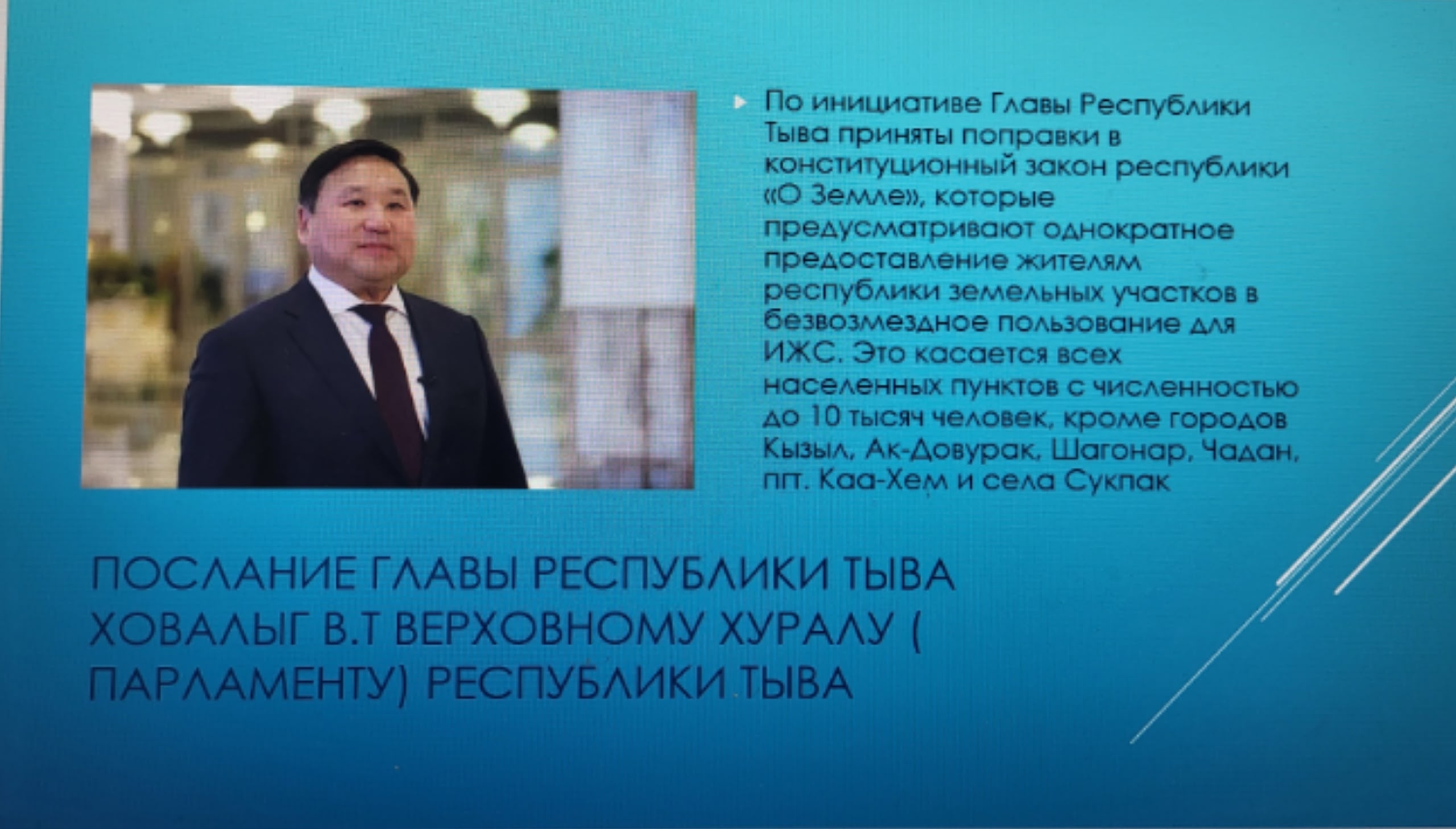 На аппаратном совещании председателя администрации района рассмотрен вопрос о безвозмездном выделении земельных участков для индивидуального жилищного строительства. Согласно докладу всего поступило заявлений - 140. Наибольшее количество заявлений поступают в с. Суг-Бажы, Бурен-Хем, Кундустуг и Сарыг-Сеп. Были разъяснены условия предоставления земельных участков, также получение заявления и документов заявителя ответственным должностным лицом уполномоченного органа; - проверка комплектности представленных документов на соответствие перечню документов. Поступившее заявление гражданина проверяется уполномоченным органом на предмет обращения заявителя в иные муниципальные образования Республики Тыва за реализацией права, предусмотренного пунктом 2 части статьи 14.3 Конституционного закона Республики Тыва «О земле». Напомним, что в Послании Главы Верховному Хуралу ( парламенту) Республики Тыва было озвучено о проекте " Доступная земля".