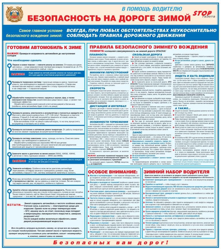 Смена низких высоких температур, характерная для зимнего периода, что приводит к таянию снега с последующим образованием растаявшего снега в ледяной покров, в том числе на проезжей части. При таких условиях передвижение по автодорогам Каа-Хемского района требует повышенного внимания и соблюдения правил безопасности. При управлении транспортным средством соблюдайте скоростной режим и дистанцию. Чтобы не стать участником аварии в зимний период, обязательно замените на своих автомобилях летнюю резину на зимнюю. На скользкой дороге тормозной путь автомобиля значительно увеличивается. Возрастает вероятность заноса машины на скользкой дороге. Обычное (летнее) безопасное для перехода расстояние до машины нужно увеличить, и в каждой конкретной ситуации - быть крайне внимательным. Будьте осторожны, находясь вблизи буксующей машины: в любой момент автомобиль может резко вырваться из снежного плена в любую сторону. Держитесь подальше от работающей снегоуборочной машины. При передвижении на общественном транспорте также следует помнить о гололеде на дороге при высадке и посадке. При движении по зимней дороге (в гололед, по свежевыпавшему снегу, укатанному снегу) необходимо помнить: • соблюдайте дистанцию (она позволит избежать столкновение); • соблюдайте боковой интервал (он обеспечивает безопасность движения); • не нарушайте скоростной режим; • не делайте резких торможений и движений. Можно выделить на зимней дороге следующие потенциально опасные участки, где транспортные средства останавливаются, притормаживают или начинают движение: • около въездов на главную дорогу в местах нерегулируемых перекрестков; • возле остановок. Проезжать такие участки или подъезжать к ним надо крайне осторожно, поскольку дорожное полотно, покрытое льдом, на них отполировано до зеркального блеска шинами набирающих скорость и тормозящих автомобилей. Скользкие участки на дорогах встречаются: • на опушках леса в зоне снежных переметов; • в разрывах лесозащитных насаждений; • на перекрестках и развилках дорог; • после и перед крутыми поворотами, возле которых многие водители сначала притормаживают, а потом увеличивают скорость движения. Если вы решили совершить обгон на скользкой дороге, необходимо заранее подготовить хотя бы один вариант ухода от столкновения на тот случай, если обгоняемый невольно или вольно станет вам мешать, а если таких вариантов нет, то лучше воздержаться от обгона. Кроме того, следите за сообщениями о прогнозах погоды: в случае ее ухудшения воздержитесь от поездок. Будьте осторожны и всегда пристегивайтесь. Помните, если дорога скользкая как стекло – ни одна резина не поможет, какая бы она не была «супер - зимняя».