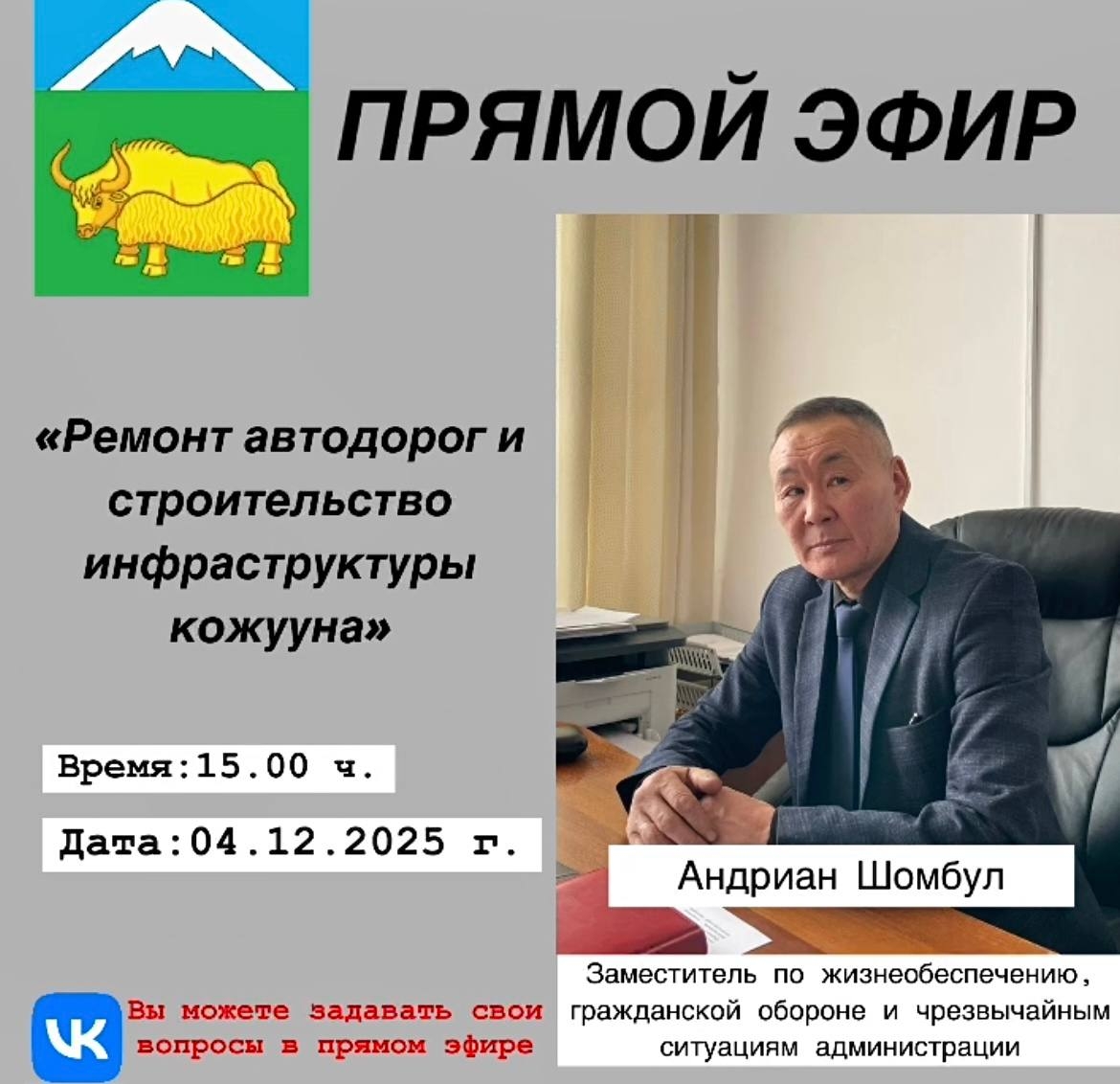 Уважаемые жители Монгун-Тайгинского кожууна! Приглашаем вас на прямой эфир с заместителем по жизнеобеспечению, гражданской обороне и чрезвычайным ситуациям администрации. Дата: 4 декабря 2025 года Время: 15:00 Тема эфира: "Ремонт автодорог и строительство инфраструктуры кожууна" В ходе прямого эфира вы сможете задать интересующие вас вопросы и получить ответы от компетентного специалиста. Не пропустите! Прямой эфир пройдет: https://vk.com/mongyntaiga