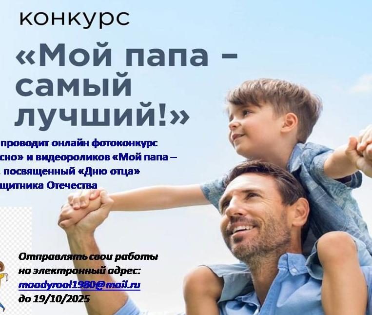 Положение   О проведении муниципального онлайн фотоконкурса «С папой интересно» и видеороликов  «Мой папа – самый лучший», посвящённого «Дню отца» в рамках Году защитника Отечества Общие положения Настоящее положение определяет цель, задачи, условия и порядок проведения онлайн конкурсов «С папой интересно», «Мой папа – самый лучший», посвященного «Дню отца» в рамках Году защитника Отечества. Цель онлайн конкурсов является формирование представления об успешной, счастливой и крепкой семье, принятие ценностей семейной жизни. Задачами онлайн конкурсов являются: Формирование чувства сопричастности к родному дому, семье, детям; Организация совместной деятельности отцов и детей, творчество, развития семьи; Формирование крепкой социальной связи отцов с детьми; Онлайн конкурсов проходит по номинациям: «Папа в деле» «Мой папа герой» «С папой интересно» «Самый творческий папа» Организатором онлайн конкурсов является Администрация муниципального района «Овюрский кожуун» 2.Участник конкурса 2.1. Участниками конкурса могут стать все желающие. Возраст участников не ограничен. 3.Общие требования к конкурсным работам 3.1. Конкурсные работы должны сделаны участниками конкурсов 4.Условие и порядок проведения 4.1. Конкурсы проходят в дистанционном формате. 4.2. Участники может предоставить для участия в конкурсах 1 работу (фотографию или видео) только в одной номинации. 4.3. Приём конкурсных работ и публикация их на соцсетях администрации с 13 по 19 октября 2025г. 4.4. Участники присылают свои фото и видео на электронный адрес maadyrool1980@mail.ru указав: пометкой фотоконкурс «Мой папа лучший» и видеоролик «Мой папа – самый лучший» названии номинации; 4.5. Фотографии и видео, присланные на конкурс, могут быть отклонены от участия в  фотоконкурсе и видеороликов в следующих случаях: Фотографии и видео не соответствуют тематике конкурса; Низкое техническое качество; Организатор имеет право не допускать к участию в конкурсе фотографии, не соответствующие требованиям, без предоставления дополнительных объяснений. 5. Критерии отбора победителей конкурса 5.1. Соответствие теме конкурса. 5.2. Оригинальность фотографии. 5.3. Общее восприятие от работы. Каждый критерий оценивается по шкале от 1 до 5 баллов. 5.4. Победители фотоконкурса получают дипломы за 1,2,3 место. Желаем всем удачи!