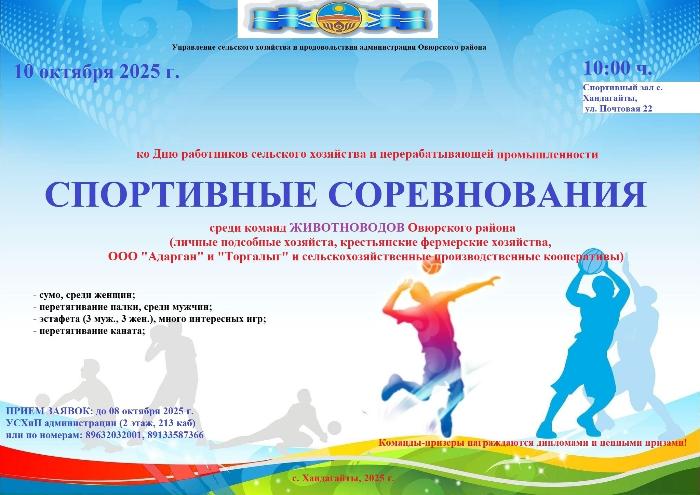 Спартакиада ко Дню работников сельского хозяйства и перерабатывающей промышленности! 10 октября 2025 года пройдет районная спартакиада среди животноводов и сельскохозяйственных предприятий Овюрского кожууна. Заявки на участие в спартакиаде в командных видах спорта (эстафета, перетягивание палки, перетягивание каната, сумо среди женщин) подаются до 08 октября 2025 года. Оставить заявку можно в Управлении сельского хозяйства и продовольствия администрации кожууна (2 этаж, каб.213) или по номерам: 89632032001, 89133587366
