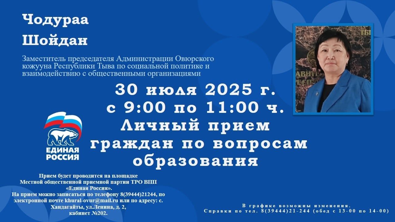 Местная Общественнаяприемная партии "ЕДИНАЯ РОССИЯ" в Овюрском кожууне, с 28 по 31 июля 2025 г. проведёт прием граждан по вопросам образования! Прием будет осуществляться на 2 этаже администрации Овюрского района, кабинет 202. Гражданам на личный прием можно записаться по телефону: +7 (39444) 2-12-39, 2-1244 #ЕдинаяРоссия #ЕдинаяРоссияТува #ЕРОВУР #РОПТува #МОПОвур
