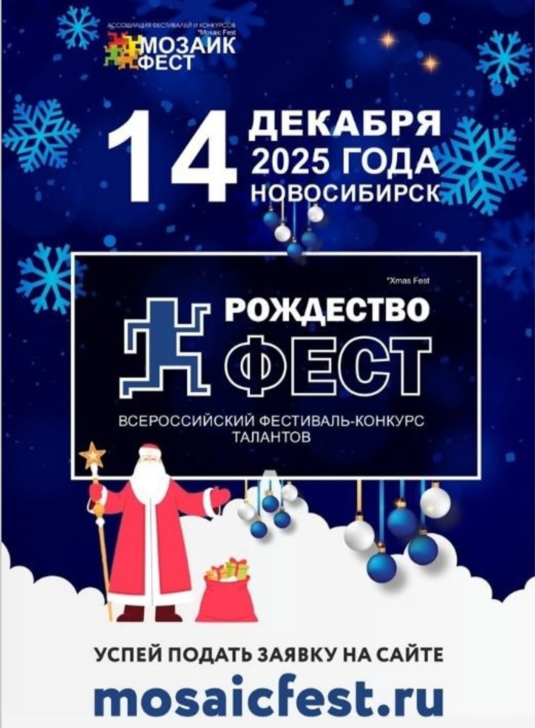 РОЖДЕСТВОфест (Xmas Fest) в Новосибирске! 14 декабря 2025 года в Новосибирске состоится VI Всероссийский фестиваль-конкурс талантов «РОЖДЕСТВОфест»! Приглашаем к участию артистов всех возрастов и направлений: вокал, хореография, театр, музыка, поэзия, кино, фото и многое другое! Что вас ждет: • Выступления на одной сцене с тысячами талантов со всей России. • Кастинг для Новосибирского детского театра мюзикла. • Подарки от Деда Мороза! • Профессиональное жюри и ценный опыт. Подробности и подача заявок: https://mosaicfest.ru/ Организаторы просят оказать информационную поддержку мероприятию. Давайте вместе создадим настоящее зимнее чудо! #РОЖДЕСТВОфест #XmasFest #Новосибирск #ФестивальТалантов #MosaicFest #Таврида #СибирьКонцерт #МолодежноеТворчество #НовыйГод #Рождество