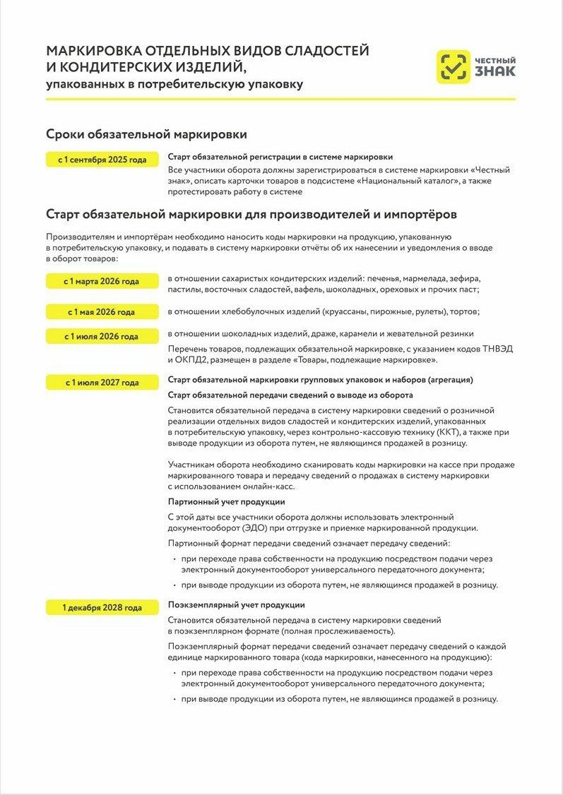 Важная информация для производителей и потребителей сладостей и кондитерских изделий! С 1 сентября 2025 года в России начинается поэтапное введение обязательной маркировки сладостей и кондитерских изделий. Это связано с постановлением Правительства РФ от 31 мая 2025 г. № 818, целью которого является повышение прозрачности и контроля за оборотом товаров. Этапы введения маркировки: • С 1 сентября 2025 г. – регистрация в информационной системе мониторинга Честный Знак. • С 1 марта 2026 г. – обязательная маркировка сахаристых кондитерских изделий, печенья, вафель и других видов. • С 1 мая 2026 г. – обязательная маркировка мучных кондитерских и хлебобулочных изделий (с некоторыми исключениями). • С 1 июля 2026 г. – обязательная маркировка шоколада, жевательной резинки и десертных творожных сырков. Это важный шаг к улучшению качества продукции и защите прав потребителей! Следите за новостями и будьте в курсе изменений! #Маркировка #КондитерскиеИзделия #ЧестныйЗнак #СоответствиеСтандартам #ЗащитаПотребителей #Сладости #Россия