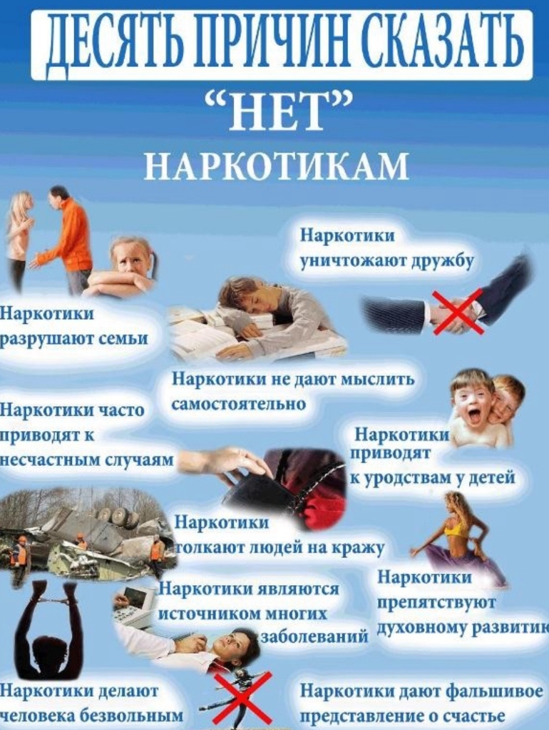 Нет наркомании! Наркомания — это не только опасное заболевание, но и путь к разрушению жизни. Она уничтожает здоровье, разрушает отношения и мешает достигать целей. Каждый из нас может сказать “нет” и выбрать путь к здоровье и счастью: Ведите здоровый образ жизни Стройте позитивные отношения и окружайте себя поддержкой Ищите помощь при необходимости — не бойтесь обращаться к специалистам Рассказывайте другим о вреде наркотиков и вдохновляйте на правильный выбор Помните: настоящая сила — в способности противостоять соблазнам и выбирать лучшее для себя и близких! Будьте ответственными, берегите себя и своих близких! Нет наркотикам — только здоровье и счастье!