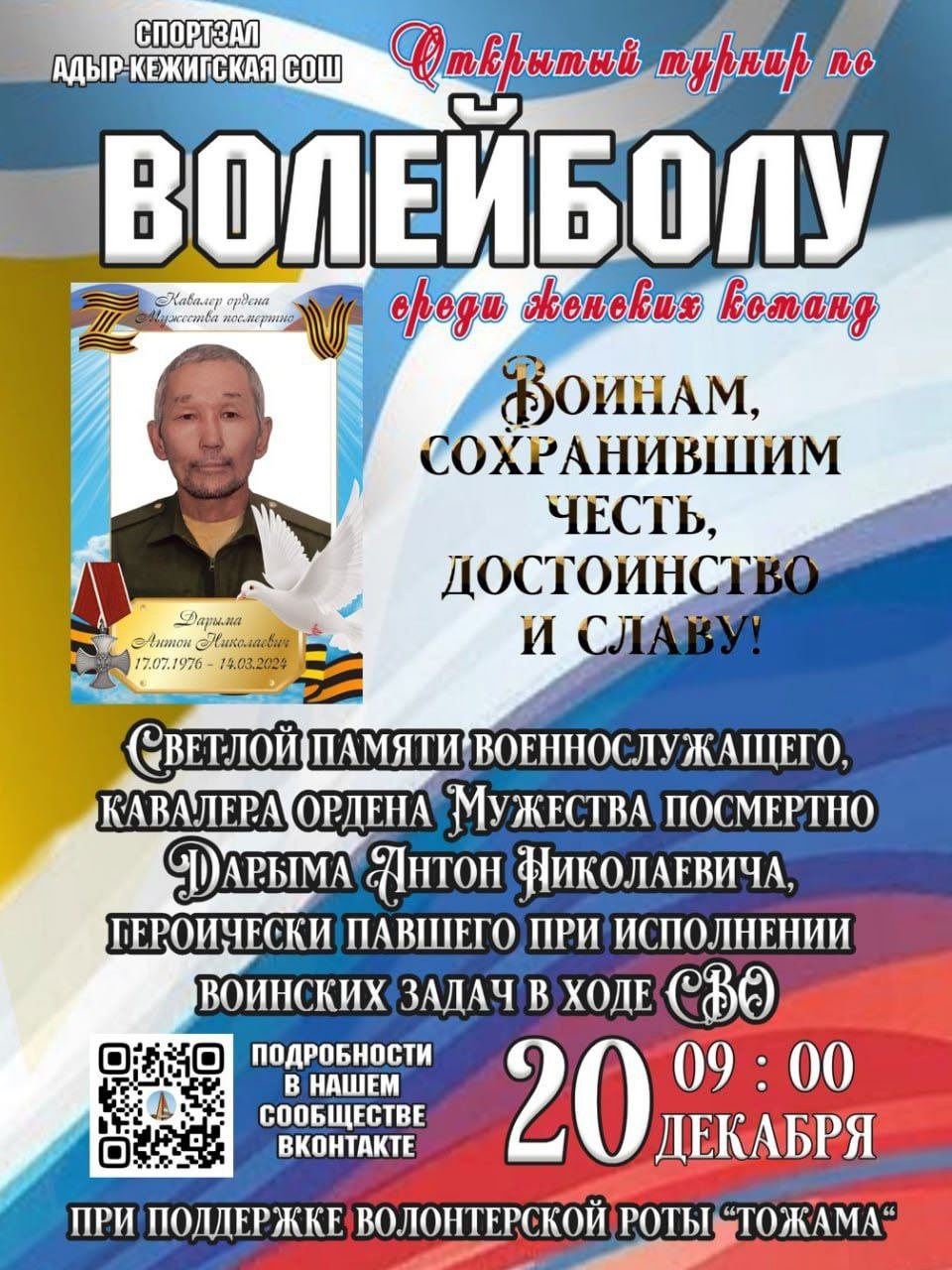 ПОЛОЖЕНИЕ о проведении открытых кожуунных турниров по волейболу среди женских и мужских команд, посвящённых светлой памяти военнослужащего, кавалера ордена Мужества посмертно, Дарыма Антон Николаевича, героически павшего при исполнении воинских задач в ходе СВО. Цели и задачи спортивных соревнований: - увековечивание светлой памяти военнослужащего, кавалера ордена Мужества (посмертно), Дарыма Антон Николаевича, героически павшего при исполнении задач воинской службы в ходе СВО, а также в честь Года Защитника Отечества в Российской Федерации и Республике Тыва, в честь 80-летия Великой Победы в ВОВ; - развитие и популяризация спорта в Тоджинском кожууне, а также повышение уровня физическойподготовленности населения; - развитие патриотизма среди населения; - пропаганда здорового образа жизни; - выявление сильнейших команд; - привлечение населения к регулярным занятиям физической культурой и спортом. Сроки и место проведения Соревнования по волейболу среди женских команд проводятся в спортивном зале МБОУ Адыр – Кежигской СОШ с. Адыр – Кежиг Тоджинского кожууна,20 декабря 2025 года с 09ч.00м. Соревнования по волейболу среди мужских команд начинаются 20 декабря 2025 года. Игры среди мужских команд начинаются после финальных игр женских команд. Организаторы соревнований Общее руководство соревнованиями осуществляют семья Героя Дарыма Антон Николаевича - жена Героя Чойганмаа Васильевна Дарыма, а также волонтерская рота «Тожама». Главные судьи - учителя физической культуры, в проведении соревнований принимают участие также преподаватели по физической культуре МБОУ Адыр-Кежигская СОШ. Требование к участникам соревнований К участию в соревнованиях по волейболу допускаются команды Тоджинского кожууна, желающие принять участие в данном соревновании, в возрасте 18+, количество команд не ограничено. Расходы по командированию участников турнира обеспечивают командирующие организации. Награждения Команды, занявшие призовые места награждаются грамотами, медалями и ценными призами, а также денежными призами. Также награждаются лучшие игроки в номинациях - лучший нападающий, лучший защитник, лучший связующий, либеро команды, лучший игрок. Победители награждаются от имени павшего военнослужащего, участника СВО, кавалера ордена Мужества (посмертно) Дарыма Антон Николаевича - его семьей и супругой Дарыма ЧойганмааВасильевны. Заявки Предварительные заявки на участие в турнире принимаются в администрации СПС Азас в срок до 09-00 20 декабря 2025г. Электронная почта: azasskiy45@mail.ru Контактные телефоны: Алдын-Кыс Анатольевна, 89133553760. Данное положение является официальным вызовом к участию в соревнованиях!