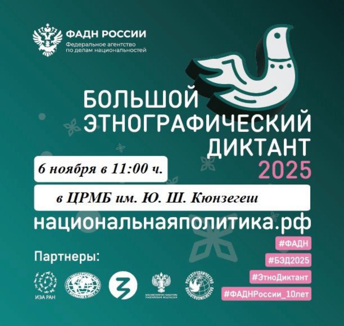 6 ноября 2025 года в 11:00 часов на базе Центральной районной модельной библиотеки им. Ю. Ш. Кюнзегеша с. Тоора-Хем пройдет #БЭД2025 X-ая Всероссийская просветительская акция «Большой этнографический диктант». Приглашаем всех жителей нашего села принять участие в написании диктанта. Юбилейная, десятая по счёту акция направлена на укрепление общероссийской гражданской идентичности на популяризацию традиционных российских духовно-нравственных ценностей и борьбу с фальсификацией истории, что соответствует задачам нацпроекта «Семья», реализуемого по решению Президента России Владимира Путина. «Большой этнографический диктант» — это уникальная возможность для жителей нашего района проверить свои знания о традициях, языках, истории и культуре народов, населяющих нашу страну. В этом году диктант будет состоять из общих 20 вопросов для молодых людей до 16 лет и 30 вопросов – для тех, кто старше 16 лет.