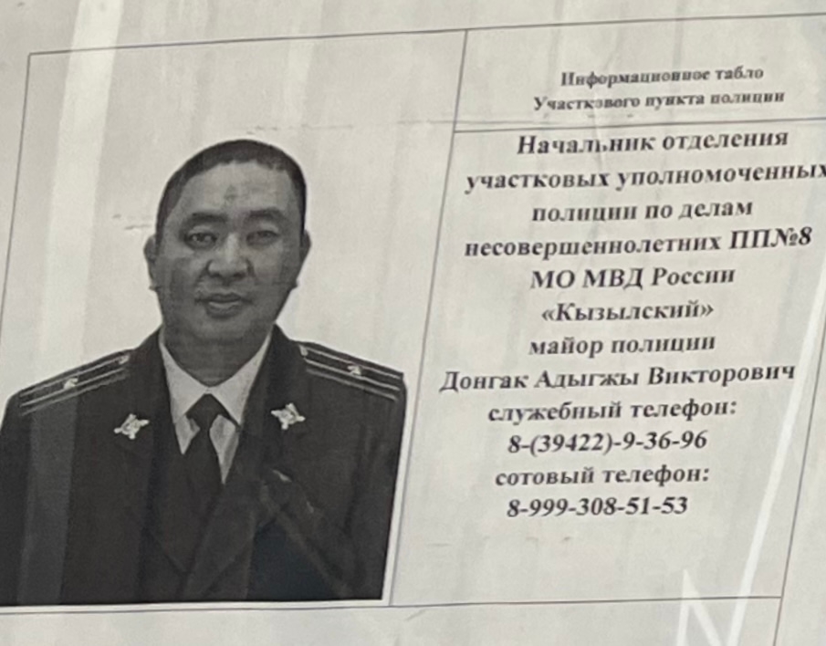 Уважаемые жители Тоджинского кожууна! В целях повышения уровня информированности населения и укрепления доверия к правоохранительным органам, представляем вам сотрудников участкового пункта полиции № 8 МО МВД России "Кызылский", ответственных за обеспечение общественного порядка и безопасность на обслуживаемых территориях. •Начальник отделения участковых уполномоченных полиции — майор полиции Донгак Адыгжы Викторович. Прием граждан осуществляется в здании участкового пункта полиции № 8 по субботам с 10:00 до 12:00. В ходе личных приемов гражданам предоставляется возможность получить консультации по вопросам правопорядка, безопасности, а также сообщить о фактах правонарушений и иных ситуациях, требующих вмешательства правоохранительных органов. •Старший участковый уполномоченный полиции — майор полиции Иргит Кундус-оол Эрес-оолович. Обслуживает административный участок № 1, включающий с. Тоора-Хем. Он осуществляет профилактическую работу, ведет учет и контроль за соблюдением правопорядка, а также взаимодействует с населением для своевременного реагирования на возникающие проблемы. •Участковый уполномоченный полиции младший лейтенант полиции — Кол Байлак Сергеевич. Обслуживает административный участок № 2, включающий с. Ий, Ырбан и Сыстыг-Хем. Его обязанности включают профилактическую работу, проведение разъяснительной работы среди населения, а также реагирование на обращения граждан. Обращаемся к вам с просьбой активно взаимодействовать с сотрудниками полиции, сообщать о правонарушениях, а также о любых ситуациях, угрожающих безопасности и спокойствию вашего населенного пункта. Ваша активность и сотрудничество помогают нам создавать безопасную и комфортную среду для всех жителей. Для получения консультаций, а также по вопросам безопасности и правопорядка, вы можете обращаться к нашим сотрудникам по тел. 8(394) 229-36-96