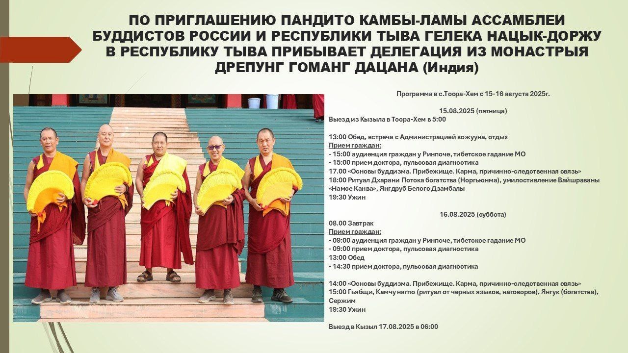 По приглашению Пандито Камбы-ламы Ассамблеи Буддистов России и Республики Тыва Гелека Нацык-Доржу в республику прибывает делегация мандального тура из монастыря Дрепунг Гоман Дацан (Индия) во главе делегации Сангпо Ринпоче. 15.08-17.08.2025 г. Делегация прибывает с визитом в Тоджинский кожуун, село Тоора-Хем. Программа: 15.08.2025 г. (пятница) Выезд в Тоора-Хем в 5:00 ч. 13:00 Обед, встреча с Администрацией кожууна, отдых 18:00 Ритуал Дхарани Потока богатства (Норгьюнма), умилостивление Вайшраваны «Намсе Канва», Янгдруб Белого Дзамбалы 16.08.2025 г. (суббота) 09.00 Завтрак Прием граждан: - 10:00 аудиенция граждан у Ринпоче, тибетское гадание МО - 10:00 прием доктора, пульсовая диагностика 13:00 Обед - 14:30 прием доктора, пульсовая диагностика 14:00 «Основы буддизма. Прибежище. Карма, причинно-следственная связь» 18:00 Гьябщи, Камчу нагпо (ритуал от черных языков, наговоров), Янгук (богатства), Сержим 17.08.2025 г. Выезд в Кызыл в 06:00 ч.