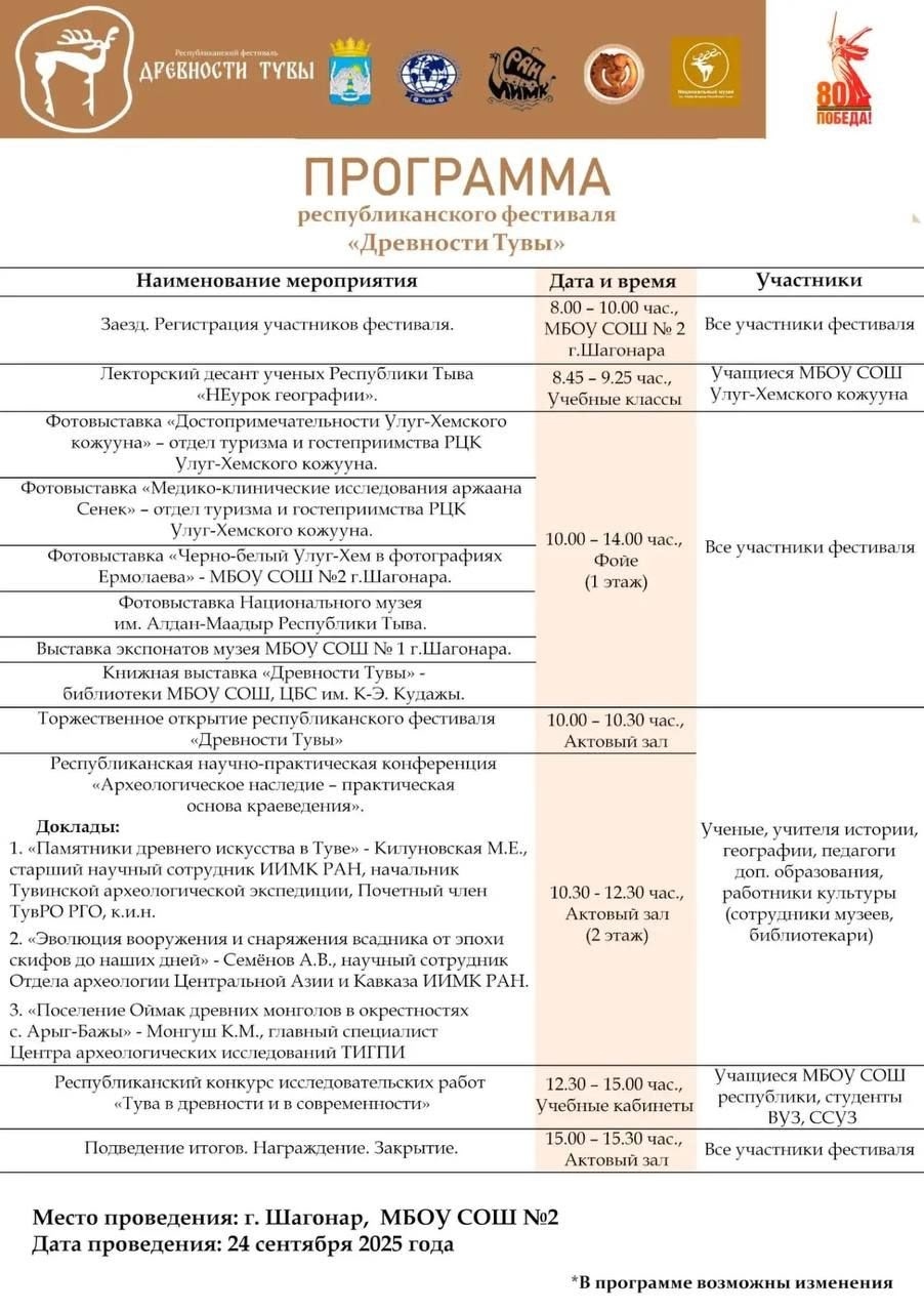24 сентября 2025 года, в целях формирования ответственного отношения к памятникам истории, природному богатству и историко-культурному наследию, через проведение комплекса мероприятий посредством активного участия школьников, молодежи и широкой общественности в научно-исследовательской деятельности состоится республиканский фестиваль «Древности Тувы», посвященный 180-летию Русского географического общества, 110-летию тувинской археологии, 60-летию Саяно-Тувинской экспедиции.
